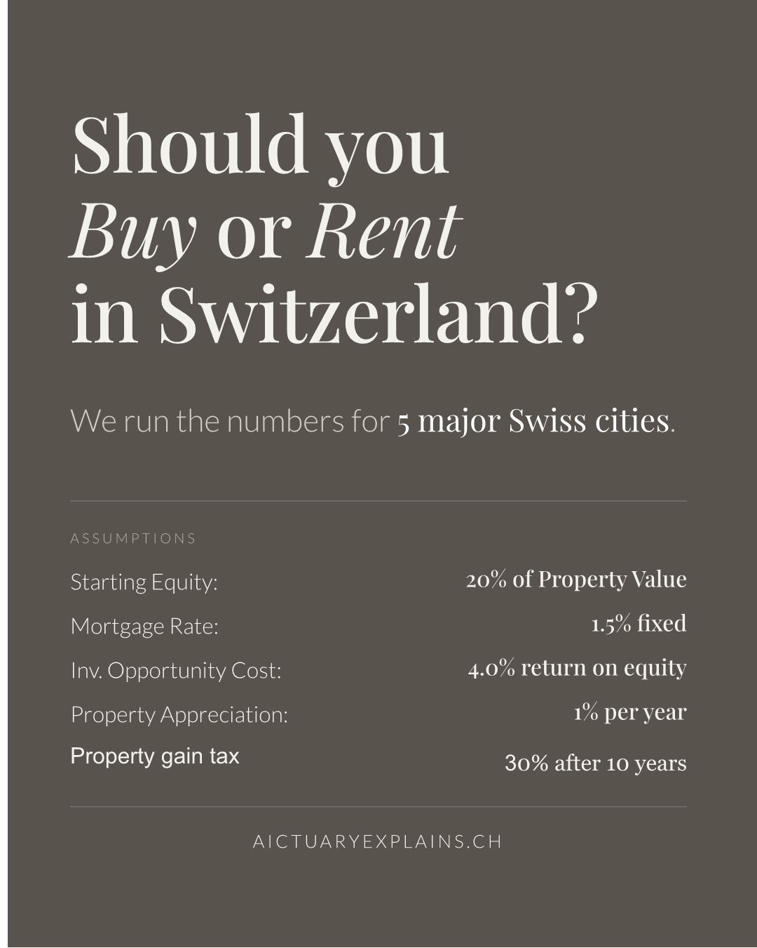 I ran all five cities through my buy vs rent calculator. It covers the details that matter in Switzerland: realistic maintenance costs, property gains tax and opportunity cost. I assumed mid range purchase price and mid range rent for each city.